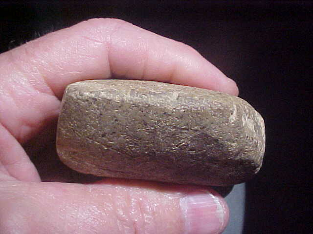 I'm going out on the proverbial limb and calling this Full Groove Axe a granite--admittedly a different granite than I've seen before (need to study my river rock, see if I can find some raw cobble that matches). The small black speckles of what (to me) looks like Phenocrysts give the stone a different look. Those black flecks, though, they might well be what attracted a toolmaker something like 7500 years ago--you're intending to make an axe, you spend hours on a rockbar along the Ohio River searching for just that one right piece or hardstone--lots of quartzite, lots of granite to choose from, but this speckled piece...well, yo get the idea, every tool maker wants their product to reflect their skill. Length was considerably shortened to only 2&11/16"--that bit area undoubtedly once being much longer, by 2&1/2". Measured on the heel the max thickness is 1&7/16". Its modern history--safe to say plows rolled the piece around in a cornfield--no use apologizing, this (the plow scratches) are as much a part of the provenance as the heavily used bit--note that the ancient user reworked a corner ding on the bit--it's real, period. Shipping is $13--checks or M.O>s are welcomed. Sorry, I do not use paypal--Roy A.