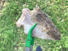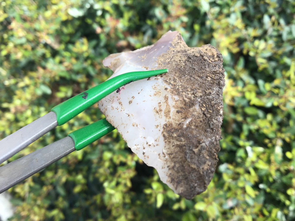 Purchased from the finder, this is a very pretty Johnson point recovered from an overhang in Hempstead county, Arkansas. One side is still covered with cave residue. It is very translucent but it does have a ding on one side of the base, probably a pick ding. If you like Novaculite, you better jump on this one it is a fine example.
