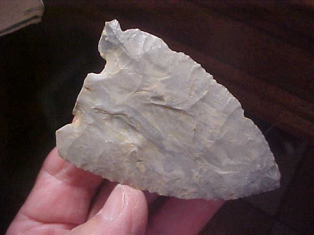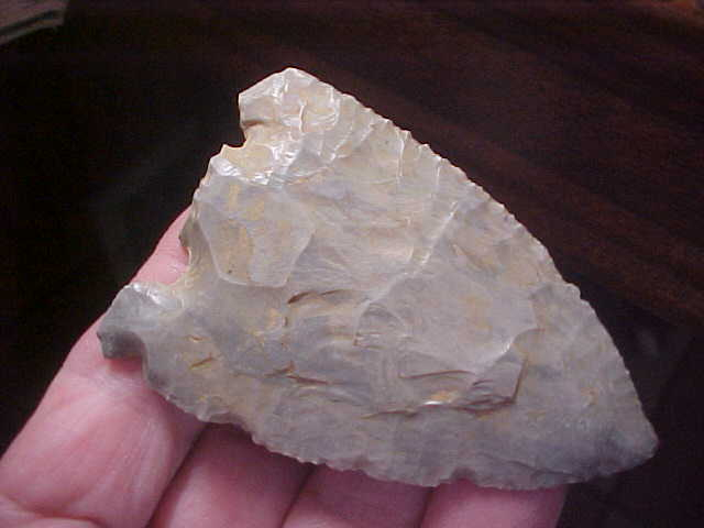 A banded form of Harrison County, Indiana, Hornstone, 3&3/16" by a wide 2&1/16"--close to (but slightly under)3/8" along the medial ridge. The Daviess County, Indiana, find has never been washed, field dirt still in the crevices--you see it as it was found. The base must have snapped shortly after the point (knife) was made, there being very little sharpening along the blade edges. The sheer width confirms that, the blade would have been narrowed by any sharpening. Note the "re-hafting" notch on the longer barb--an attempt to fit the big knife to a new handle, tie it with sinew. The shorter barb was salvaged at an angle, then highly polished. How that'd help tie the piece securely I'm not sure, but the polish is deliberate; they HAD a reason. On the notched-barb side there is a shaft-sharpening indention, use-polished as well. There is slight use--some wear, off the side of the tip. Small wear spots such as that came about from a specific function, call it a 'secondary use'--most ancient tools had those extra functions, they were part of a toolkit--and you could only carry along so many tools as you traveled. Every detail of this piece is lifetime guaranteed authentic. Shipping is $8.00, and I welcome checks or M.O.s, but please note I do not use paypal--Roy A.