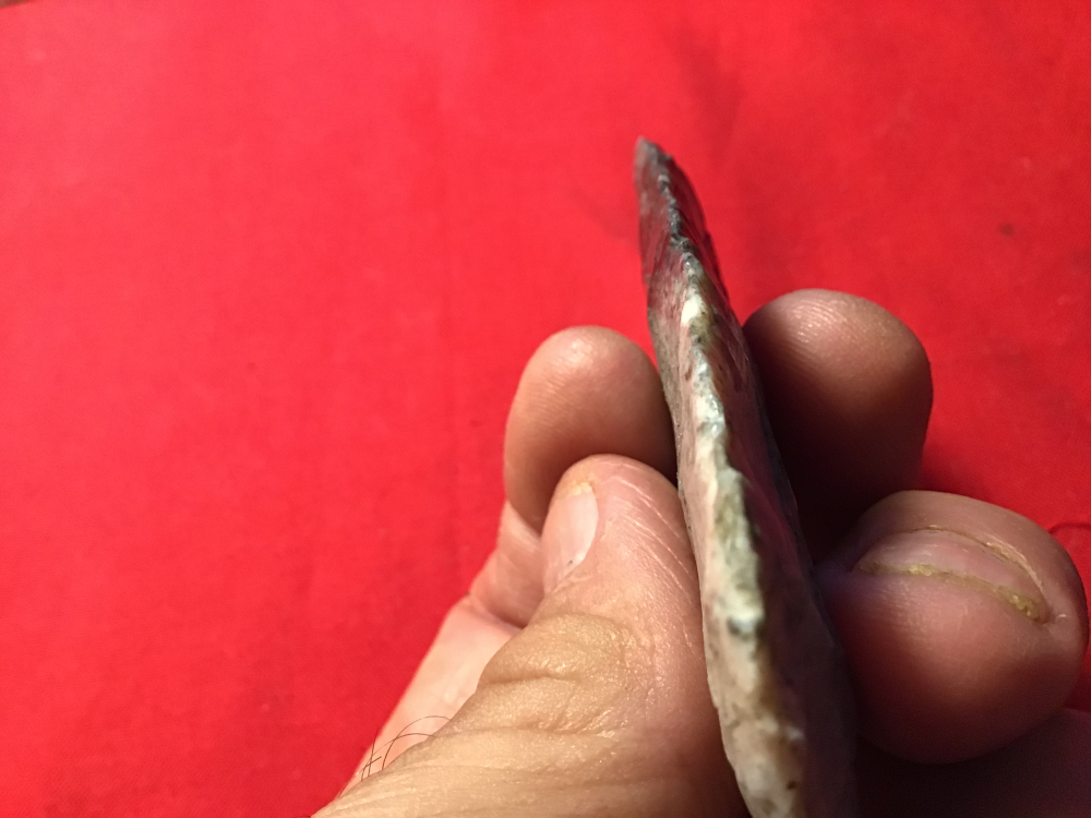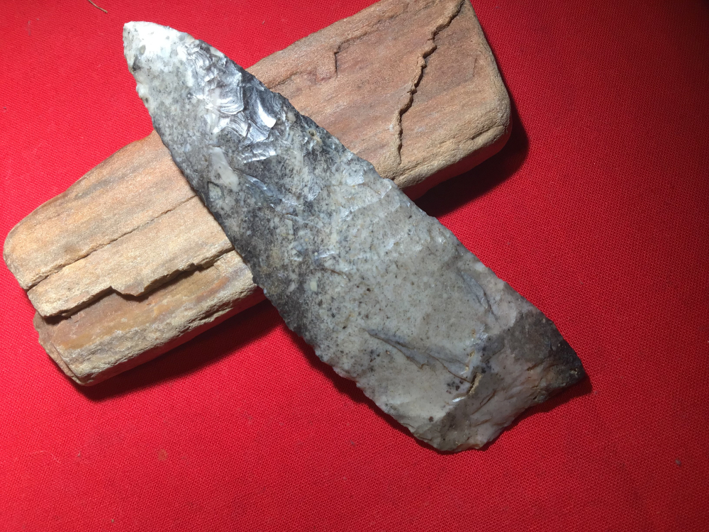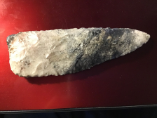 This High Plains Knife is made of river polished Winterset Chert recovered in Kansas. The base is thinned with pressure flaked lateral edges. It has a Bennett coa and I have the shipping.