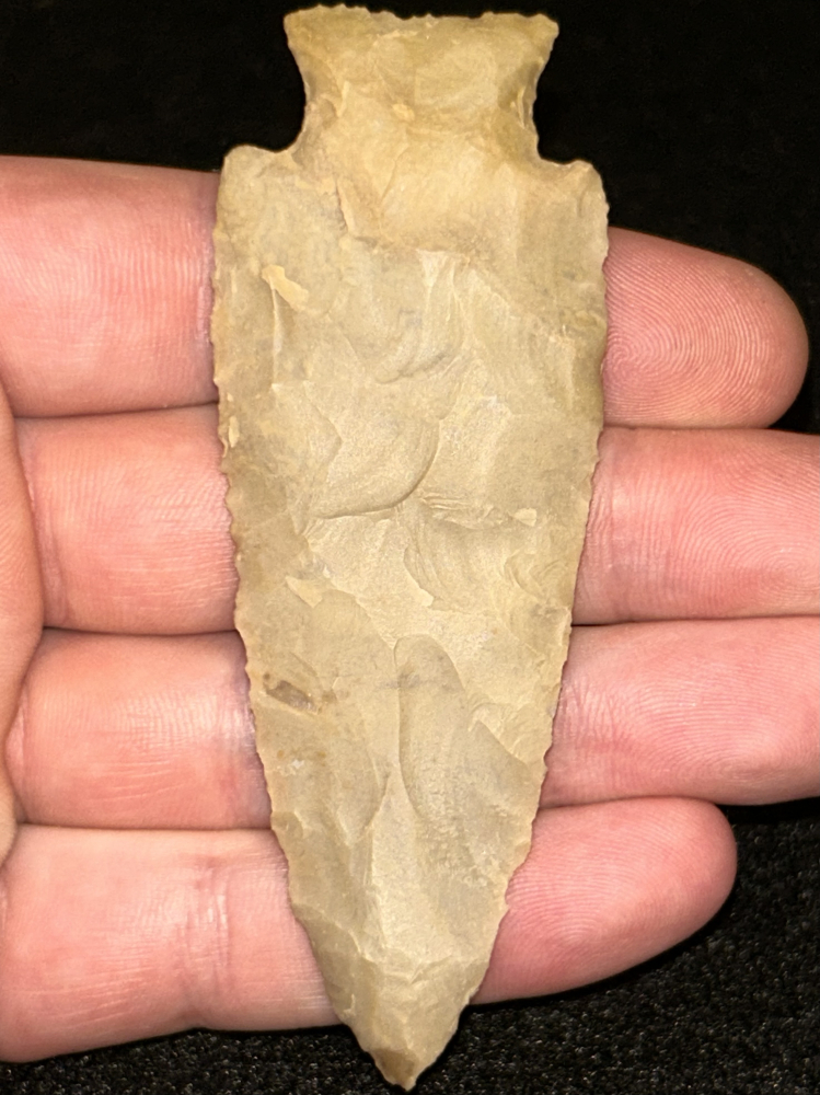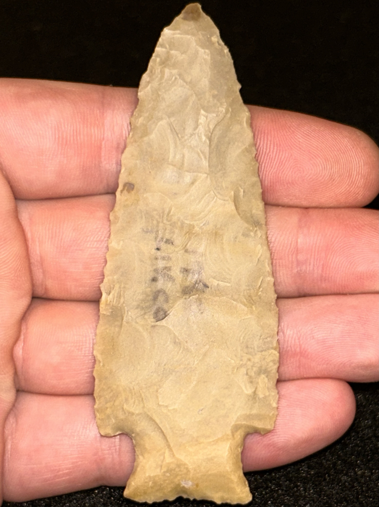A fantastic Hopewell found in Livingston County, Kentucky in 1980. Made from semi-glossy tan chert, likely Hopkinsville or Ste. Genevieve. Very thin with good size and workmanship.