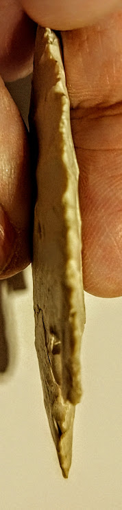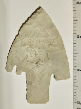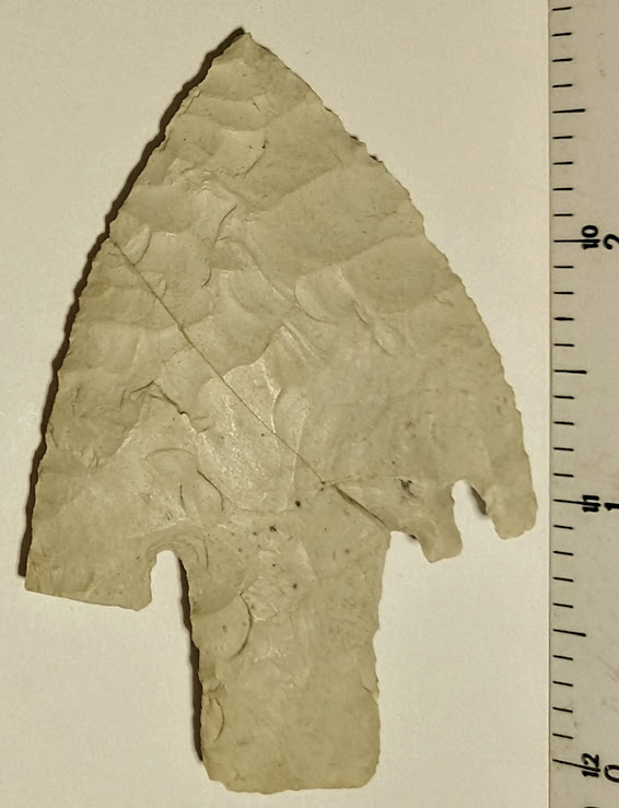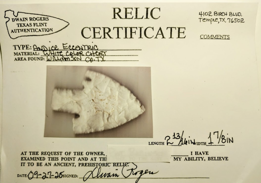 This is a rare example of an Andice Eccentric point. It was found in Williamson Co., Texas, and comes with a Dwain Rogers COA. Both ears on this piece were broken in ancient times, and one of them was re-notched to form the eccentric piece.