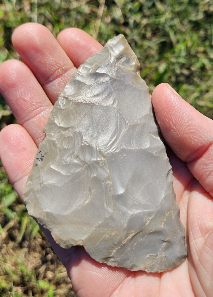 Fine skinning blade from Todd County, KY, ex Dossett. Absolute textbook skinning blade with a light polish on blade margins from use. The semicircular edge was the primary one used. Made from nice glossy hopkinsville with superior attention to detail and excellent thinning. Measures 3 3/4 inches long by 2 1/2 wide at base. Fantastic piece, don't miss it!