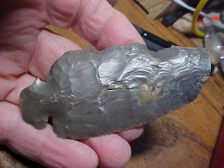 Out of Sangamon County, Illinois, a Hopewell type made of the Dover Chert "look-alike" Elco Flint found in southern Illinois--length is a strong 3&3/16" by 1&3/8"--slightly under 3/8" max thickness--durable blade, that length and thickness. The one surviving notch shows almost a "Snyders-like" round notch--the stem base shows absolutely no basal edge grinding--Hopewell knapping characteristics, both. A picture focusing on the tip area shows the extra care the Hopewell knapper went to, some fine pressure chipping--he got a bit 'rougher' as he formed the base. One face shows a cortex-type finish, what must have been the weathered outside of the flint the knapper utilized--Elco is a layer-type flint, so the preform must have been a fairly large flint slab. Wish I could tell you what the #53 signifies, but that could have been placed by the estate auctioneer--no way to know. The piece is guaranteed real, period. Shipping is USPS minimum (at least for today), $8.00, checks, cash, or M.O.s are the only ways you can pay for the piece (paypal is not used)--Roy A.