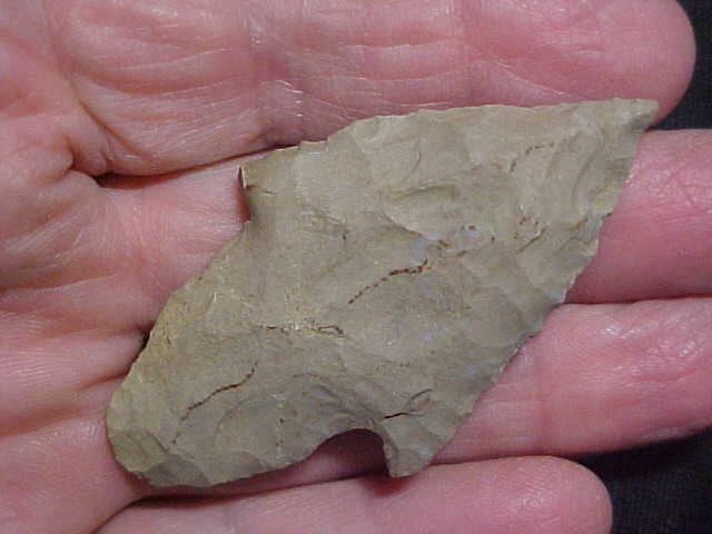 One look at that base and you know there was (to start with) a lot more blade--An Adena knapper would never make a base that large unless there was a corresponding large flint blade above it--sharpened down with use, the entire knife now measures 2&5/8" by 1&7/16"--with a 3/8" max thickness, the thickest part being nearer the tip. When the upper blade holds the thickest measurement it's a simple jump to knowing the blade was considerably larger. Made of a weathered grade of Indiana Hornstone, the piece shows almost a creek find-type patina. Because the piece came with some Perry County, Indiana, Adenas (my old hunting grounds), I know the form, the material, and can guarantee the authenticity. The one snapped-off barb is an ancient chip, and an impact fracture to the edge right above the missing barb indicates the piece was in use after that barb was broken--price reflects the ancient damage. For the work it took, the Woodland Culture hunter made a very sharp tip to a blade that was both shortened and narrowed--almost a 'burin' the tip is so sharp. Shipping is $8.00, checks, cash, or M.O.s are the payment methods I use. Sorry, I have nothing to do with paypal--Roy A.