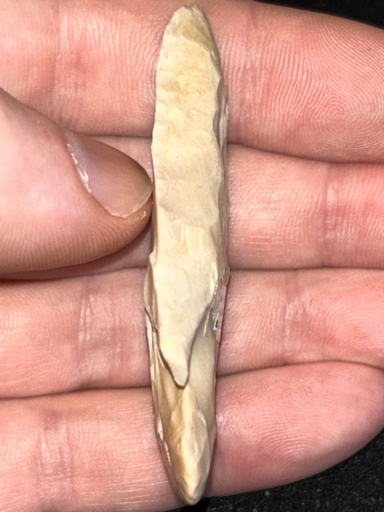 A fantastic Thebes found in Posey County, Indiana. Made from what appears to be well patinated cream colored Derby chert. Great form with steep beveled edges and ground base. Ex: Lance Wolfe and Luke Cord collections.