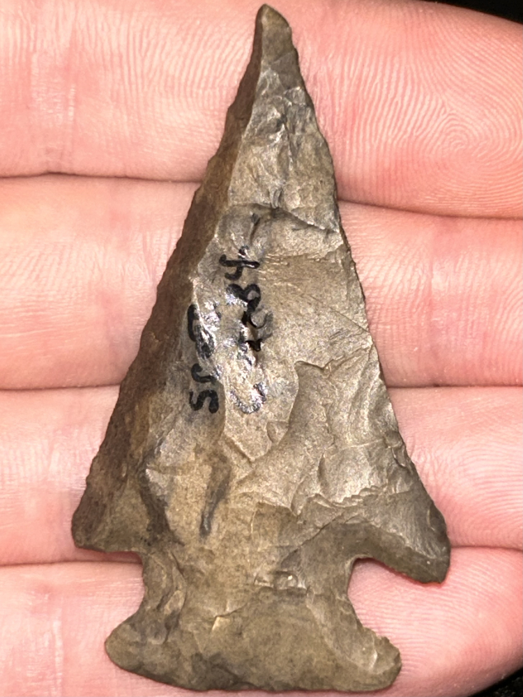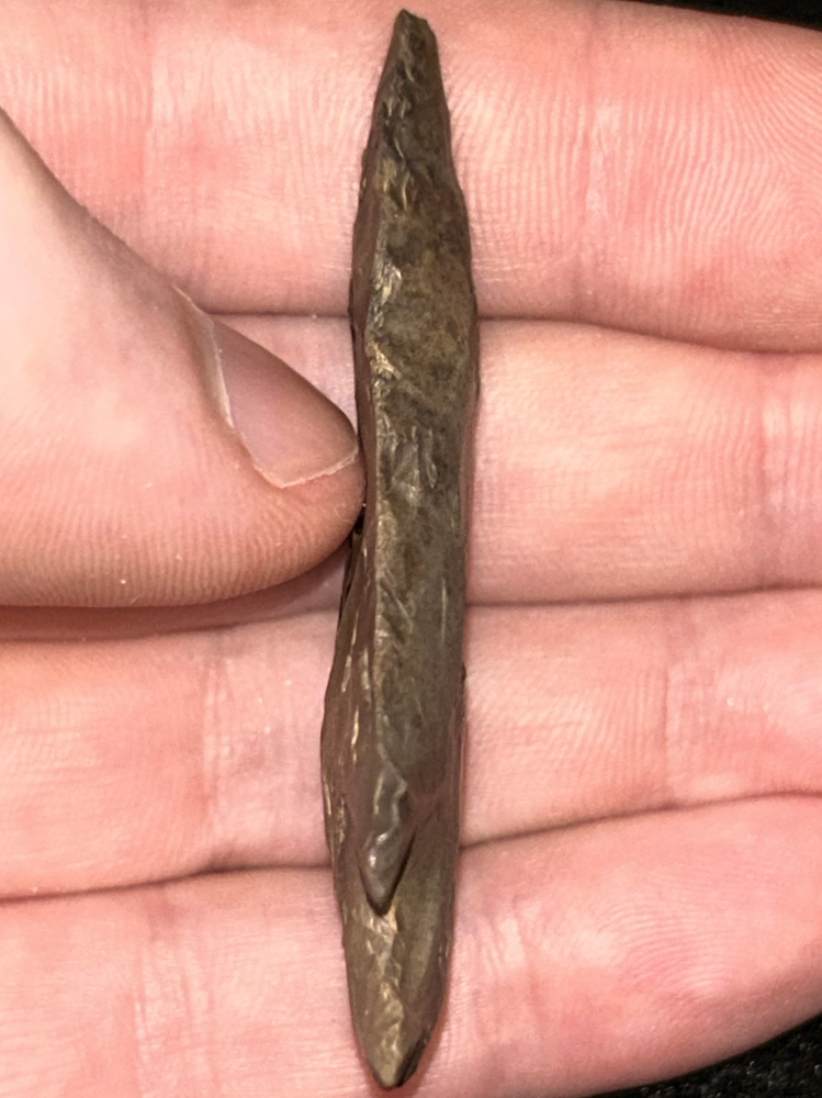 A fine Lost Lake found in Marshall County, Alabama. Made from mottled dark brown Fort Payne chert. Great age with beveled edges and ground base.
