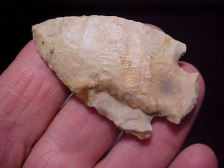 A large Cache Blade from a Vanderburgh County, Indiana, collection--not marked/ labeled to indicate it's a Crib Mound Blade--one of the 10,000--14,000 that were found at the Spencer County, Indiana, Crib Mound, but the Harrison County (Indiana) Hornstone is the right 'form' for those blades. The only difference is that this piece doesn't have the mussel shell calcium adhesions of most of the cache--so my view is that the "type is right" even if the calcium isn't 'crunchy' all over the surface. The patina has an even older feel than the Crib Blades, the flaking being those extra large flake scars of earlier cultures--I've seen Paleo blades that have this type patina, so that's what I think the piece is, and the culture that made it. With a preform you don't have a diagnostic base and blade form, you have to judge the piece by the type flaking that fashioned it, and few cultures used these big blades--4&3/8" by 2&15/16", 11/16" thickness--Paleo and Adena seem to be the only ones--you'll have to decide for yourself which you think this is, but regardless, it's REAL. Shipping is $10.00, checks or M.O.s (or cash) are the only ways to buy the piece as I do not use paypal--Roy A.