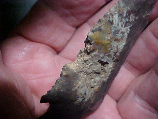 A center-of-nodule limestone inclusion was incorporated into the design of this Stilwell point by the Early Archaic knapper--he turned some rough, quartz-bearing material into a 'secondary feature' for working wood (or bone) handles. The long--almost 3&1/4"--hornstone point is from a Martin County, Indiana, collection. Width is 1&1/4", and thickness on that inclusion reaches slightly over 3/8"--that area was a 'stack' that proved too hard to thin without breaking the piece. The base has that very, very light grinding that's typical of Kirk C.N. points and Stilwells. There is a minor chip on the more rounded barb--small nick from all the blade edge sharpening. Great patina, every detail is guaranteed authentic. USPS shipping is their $8.00 minimum charge (not much I can do about that, unfortunately),a nd checks, cash, or M.O.s are how I welcome payment. Sorry, I do not use paypal--Roy A.