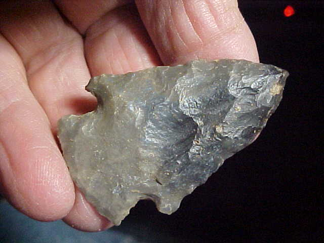 One fine piece of Hornstone--the flint itself, that is--the point is a Mid-to-Late Archaic dart, likely classified as a Big Slough, although I'm not 100% convinced--with that rounded base--that there isn't a more precise classification some archaeologist has 'coined'--the Ferry Expanding Stem seems closer ( see Projectile Points.Com for more examples). The piece has an un-ground basal edge, but some of the finest chipping (knapping) of the later Archaic periods--the finer grade material may have had something to do with it, better (higher silicate) flints working so much easier. Length is 2" by 1&5/16" with a 5/16" medial ridge. Out of Spencer County, Indiana, every detail of the point is guaranteed authentic. Shipping is $8.00 (USPS minimum anymore), checks, cash, or money orders are the ONLY ways I take payment-Roy A.
