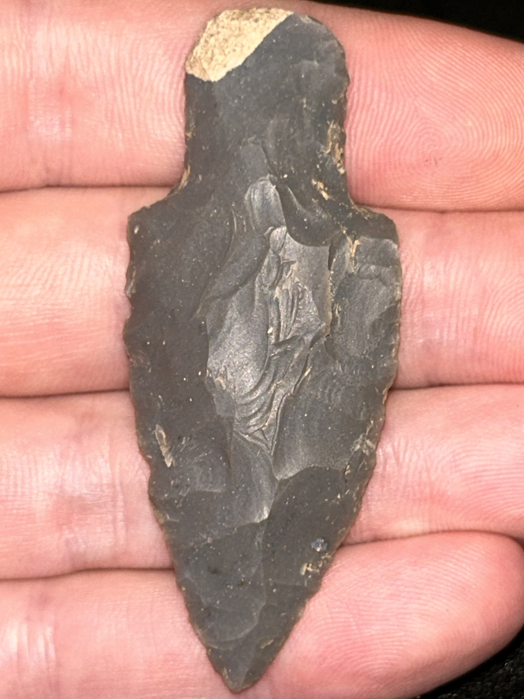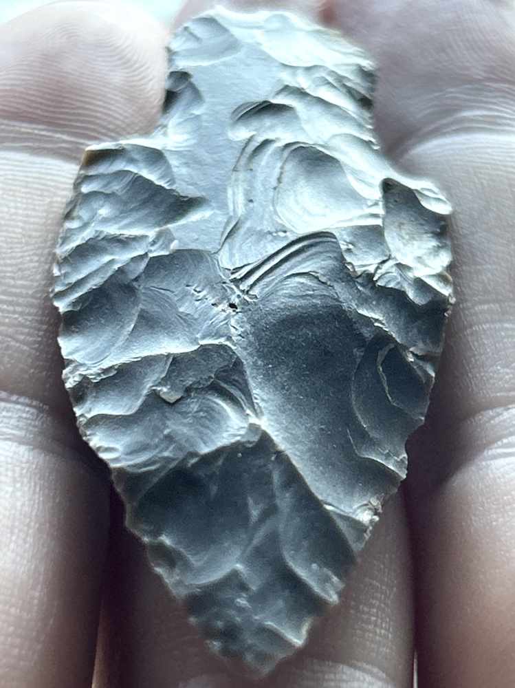 A very nice Adena found in Harrison County, Indiana. Made from medium grey Hornstone with a touch of cortex remaining at the base. Well made and in good condition.