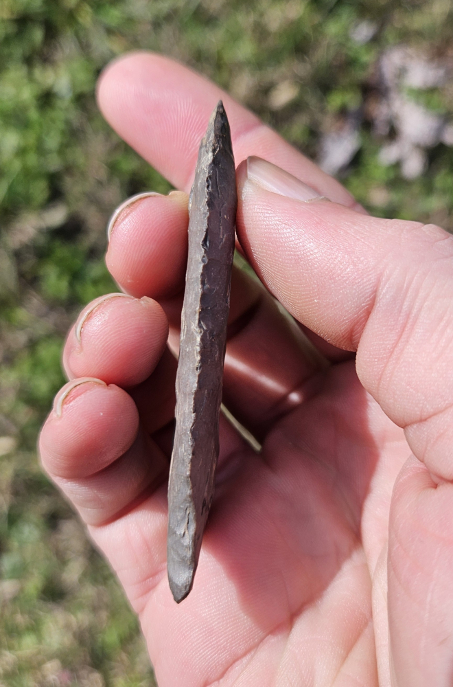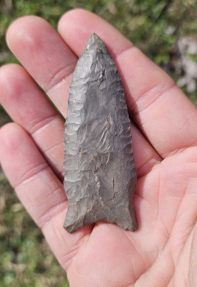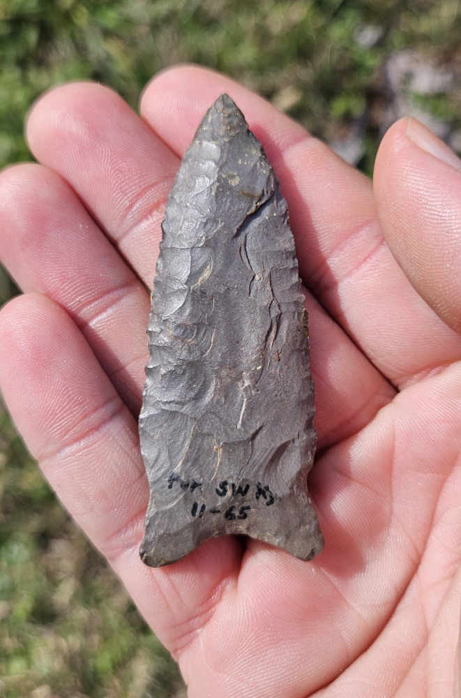 Absolutely awesome Greenbrier point from Southwest KY ex Dossett. Superb and classic workmanship with fairly minor tip restoration done many yrs ago. Great opportunity to get a beautiful piece for cheaper. Measures 2 1/2 inches long.