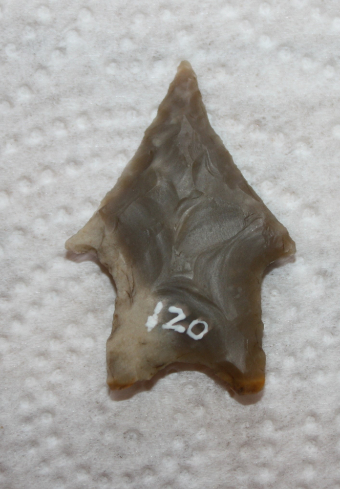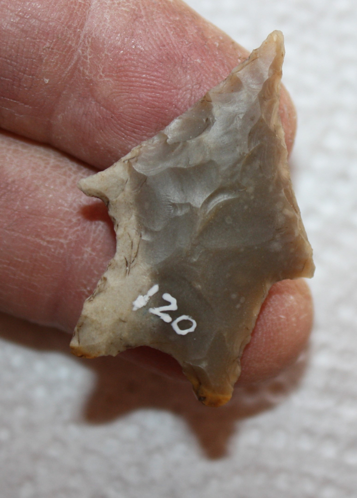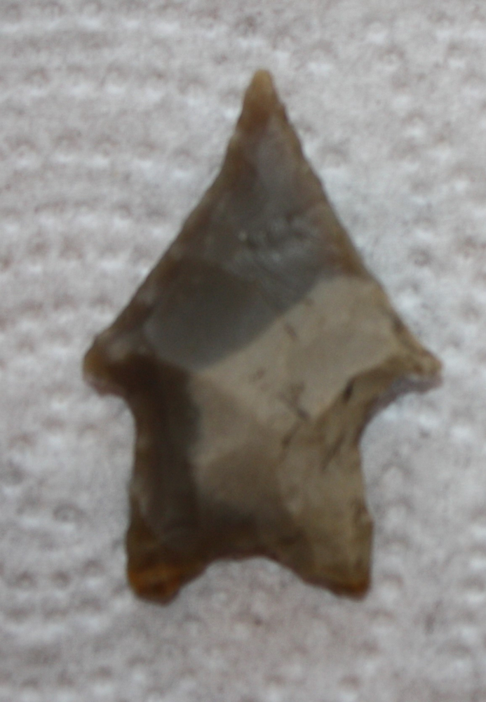 This artifact has a whitish patina scattered on both sides.