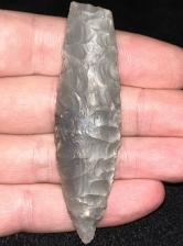 A very fine Paleo Lance found in Fulton County, Indiana. Made from quality grey Hornstone with a nice blue inclusion. Extremely thin with superb flaking.