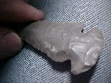 Out of either Spencer of Perry County, Indiana (where the family homes & farm were located), so without their having marked the piece when found-- a hundred years back--well, take your pick, I can only relate what the widow of the last owner knew (her husband's father and Grandfather had found what was in the collection). Length is 2.5", 1.2" (1&3/16") across the heavily ground base. One barb shows it was lost in an ancient (7500BP) sharpening. The tip shows a minor bit of ancient use & wear. There is a very small spot of glue on the side of the tip--not sure what the glue is doing there, but it should be easily removed. Every detail is real, period. Shipping is $8.00, USPS minimum these days with Holiday rates. You can pay by check, cash, or money order, but please note I do not use paypal-type services--Roy A.