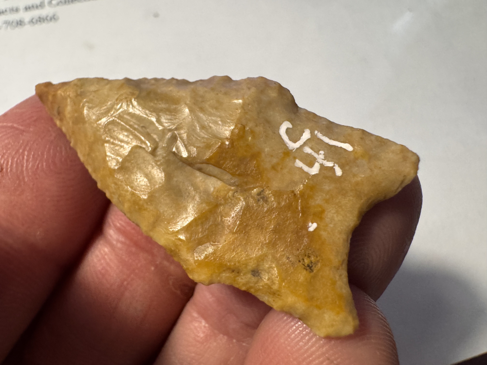 The oldest in the horizon, the Hope is straight stemmed. This classic example is ground on the base and stem and well thinned on the base made of colorful cobble chert from Sabine County with a nice tip.. I have the shipping and it comes with a Bill German coa.