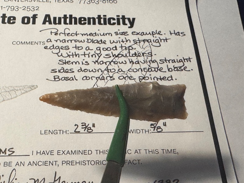 This Darl has very fine flaking made of colorful chert, may be Georgetown. From Coryell County, the stem is narrow with small shoulders. I have the shipping and it comes with a Bill German coa.
