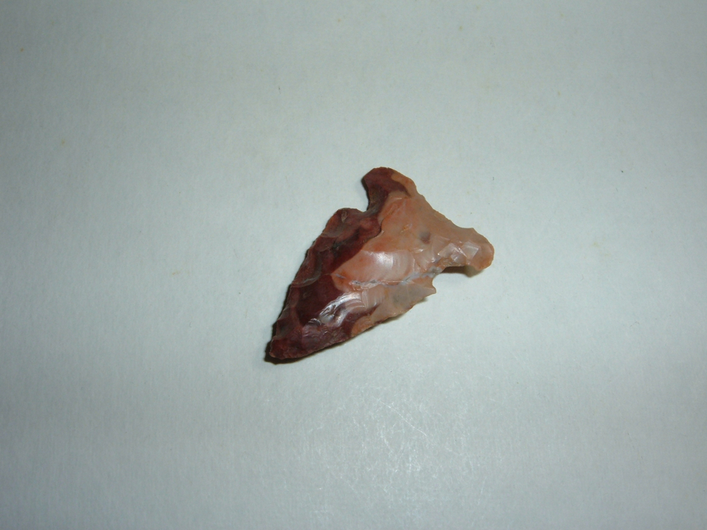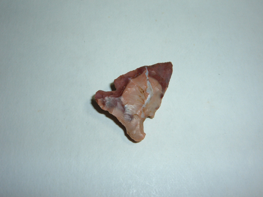 HERE WE HAVE A BEAUTIFUL SUPER COLORFUL EOB C. FOUND IN FAIRFIELD CO.OHIO IT MEASURES 1 1/8" AND IS ILLUSTRATED IN BOB'S BOOK "THE ARTIFACT COLLECTION OFROBERT N. CONVERSE. IT HAS A BEAUTIFUL QUARTZ VEIN RUNNING THROUGH IT ON ONE SIDE, A REALLY DELIGHTFUL,COLRFUL LITTLE POINT!