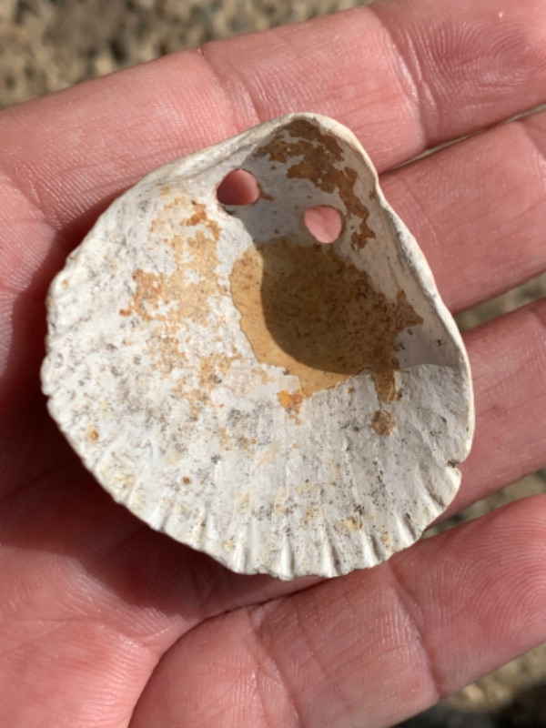 A 2 hole shell Gorget, this example is made either a small clam or scallop like shell .