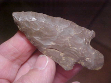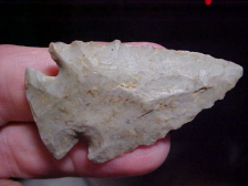 I pay the shipping on this Gibson County, Indiana, Decatur point--just barely under 2" in length, HEAVILY ground base, but a straight basal form, not a Fractured Base. Note the twin shaft scrapers indented on one blade edge--each one done from opposite faces--if anyone thinks that was accidental, I'd be very surprised...now what the purpose was in having each scraping indention cut that way--hey, if you have an idea send it to me by way of the "Ask seller a question" link--you learn by listening (to fresh ideas). Neat piece, 100% guaranteed authentic. I take payments by only three ways: checks, cash, or money orders, and they all have to go through the postal service. I do not use paypal or any of its 'clones'--Roy A.