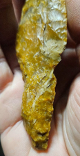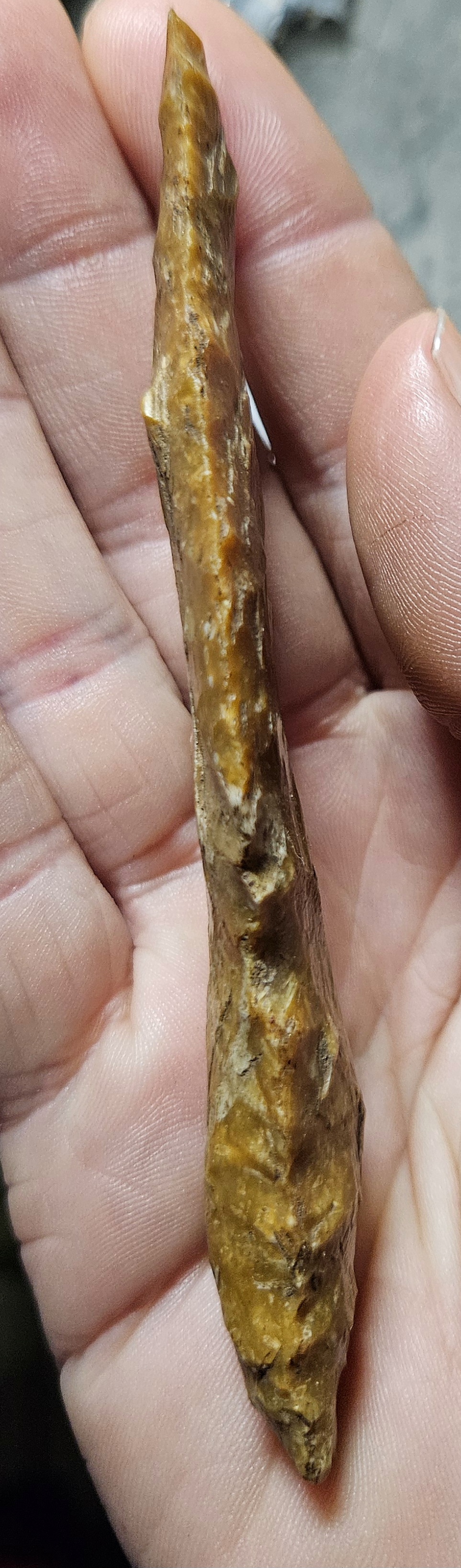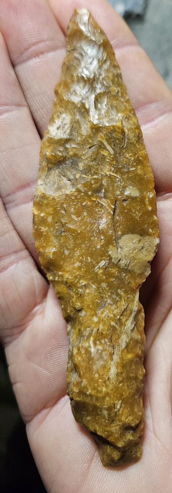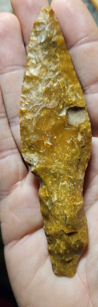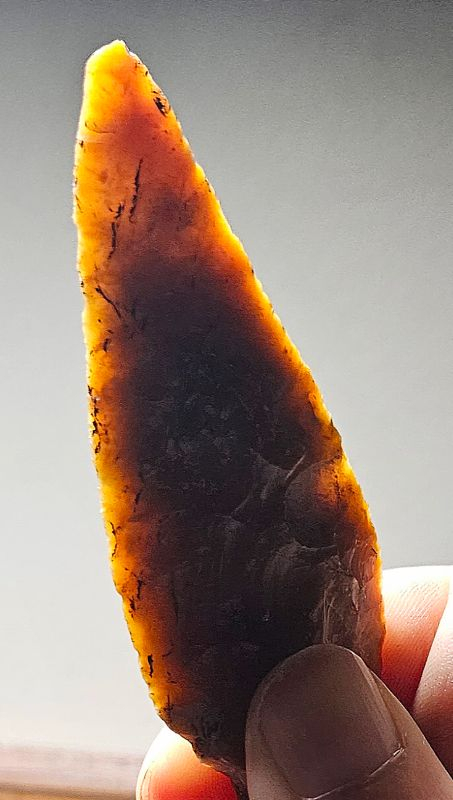 Super flint dagger type VI B from Denmark. Beautifully made with a broad blade that transitions into a thicker handle. Once upon a time the dagger was much larger and over time has undergone resharpening. Made from glorious amber orange highly fossiliferous patinated Danish flint. This was a field find many yrs ago and has a few nicks but in great condition. The handle exhibits a unique a very intentional spokeshave. Measures 4 1/2 inches long by 1 1/8 wide. Hard to find a dagger that doesn't cost a darn fortune, here is your chance!