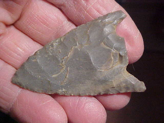 Indiana Hornstone Buck Creek, 2&1/4" by slightly over 1&1/2"--'thinness' is barely over 1/4"--if you want the translation of that set of measures: one FINE piece of flint. The Ohio River beach find comes from the Spencer/ Perry County, Indiana, river's edge--with barbs this fragile it wouldn't have survived intact (in a woods/ field), most likely. Was there ever a stem, or was the blade made as a 'snap base form'--my thought is there never was a stem as at least one of the barbs would have snapped with as much force as was necessary to break a 1/4" thick stem. Simply put--I think it was Woodland Culture made this way. The piece was in an old shoebox for the last fifty+ years, passed from father-to-son. It's 100% guaranteed real. Shipping is $8.00, checks (I always accept cash) or money orders, but this store does not use paypal-type payments--Roy A.