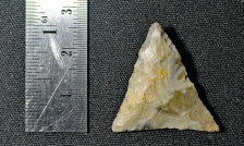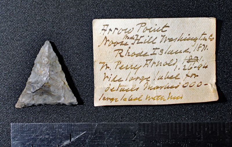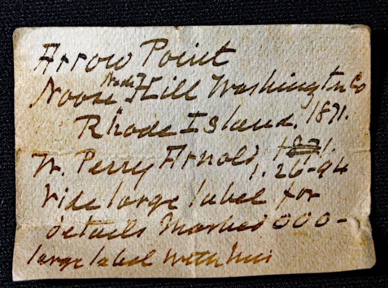 A very cool piece of Rhode Island history here. It is a very finely made Onondaga Chert woodland triangle found in the 1800's by Mr Perry Arnold on Nooseneck Hill in Washington Co RI. The paper slip reads .