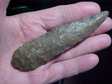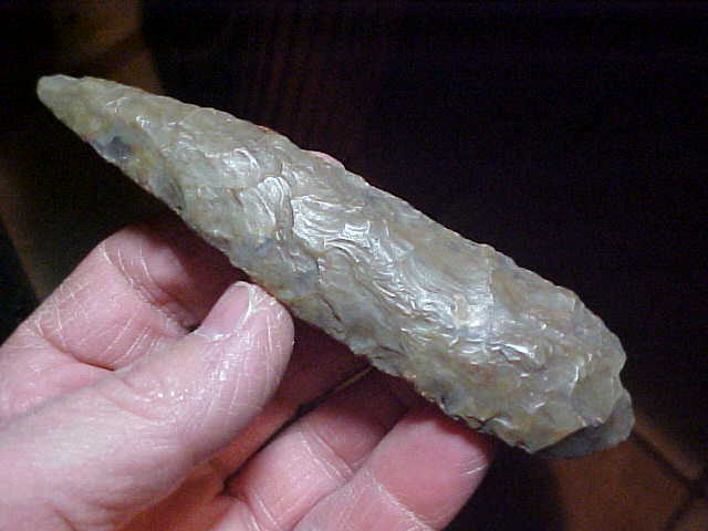 At 4&13/16", there's some size to this Cobbs Triangular. Width is 1&3/16", and next to the base the thickness reaches 9/16"--the blade isn't thin until it reaches the very tip. The long knife is out of the Sullivan/ Knox County, Indiana, area, but that flint is one--because of the creek stain-like patina--is hard to classify--it has some fossil inclusions, the tan spots, and a very good gloss, so if the knife is Attica (as I suspect) it was a higher grade of Attica (Indiana Green). Usually, that flint has a coarser grain, nowhere near this much gloss, but every flint/ chert has differing grades to be found. Note the blade edges on this long, narrow Cobbs, they're very heavily used--this was a hand-held knife that saw long, hard usage...but that also tells you the piece is authentic, that's the trade-off. Shipping is $8.00, checks, cash, or money orders are the only three ways you can pay on my store (sorry, paypal users, I just don't use electronic payments)--Roy A.