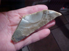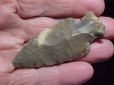 No 'hype' required when a point looks like this Hardin, a brown creekstain on the Hornstone that colors the piece a 'bronze shade'. Length is 3&1/8" by slightly over 1&11/16", with the single thickest measurement reading 5/16" between the barbs. Basal grinding is excellent, barbs are about as perfect as any you'll see. The piece is guaranteed authentic, period. NOW--why is the price so LOW? I bought the piece at an artifact show--from people I know and trust--however what wasn't noticed was that the 1/4" glued-back-on tip. The point is half price because of that tiny fragment that's glued on. Somebody gets a bargain on what WAS a grade 10 point because once upon a time someone got careless. One note: I don't blame the friends I bought the piece from, I doubt they caught the tip break either. In some lighting you won't notice the break, but when you put any (and EVERY) purchase under a loop (as I do), sometimes you "grin and bear it"...and, if sold, you tell any and all faults. Personally, I think the 'glue job' is needing professional repair; Keith Etchison would be my first choice if I would send the point off--you may use Bushey or one of the other artists in repair work--your choice. Shipping is $8.00, checks or M.O.'s (or cash) are the only ways you can buy this piece as I do not use paypal-type payments--Roy A.