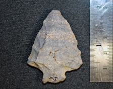 Neat little Pennsylvania Perkiomen point. These are often associated with mobile Late Archaic groups that traveled along river valleys and into upland settings. This example is made of banded rhyolite and measures just shy of 2 inches long. It is not in the finest condition, showing an ancient tip ding, but it remains more than 95 percent intact overall.