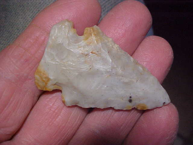 Heavy, heavy basal edge grinding on this Cornernotched Pinetree--Indiana collection, my area, and a form of Chalcedony that's either Spencer County, Indiana, Holland Flint or a close cousin--Ohio collectors will see the similarities to some Flint Ridge Flint/ Chalcedony. A couple things to note: there were multiple sharpenings of the blade on this point--you don't get to a beveled edge with that not being the case. But, with those repeated sharpenings (it's a knife, after all) the barbs and the basal corners also (almost always) reflect minor nicks...use does that. Another feature to point out is that the tip was a burin--under a 10x loop you see the wear-down of the flake ridges--your hands will feel the wear polish as well--not as heavy as that basal edge grinding, but flint wears, it polishes from repeated use. The finder is deceased, so I can't ask if the point is a Vanderburgh County, Indiana, find, or some area county--you now know what I do--his name will go to the next owner, keep the provenance together. Shipping is $8.00 with checks, cash, or money orders the only three ways I take payment. Sorry, paypal users, I do not use electronic payments--Roy A.