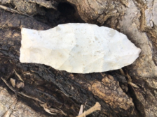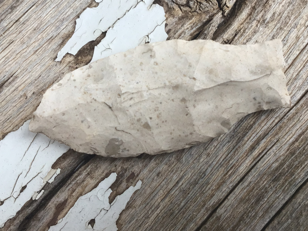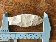 White Chert Travis found by David Shand near Wimberly in Hays County. It has heavy patina with mineral deposits on the blade.with a straight base. I have the shipping and it comes with a Bill German COA.