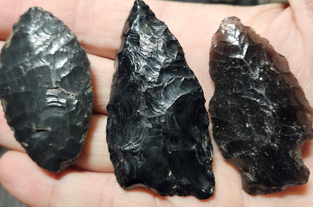 Awesome lot of obsidian blades with a fluted paleo in the middle. All found in Nevada and very nice for the price. Largest measures 2 1/4 inches long.