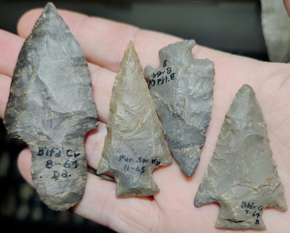 Fine group of points from various caves in Todd County, Kentucky. Each one has some amount of restoration, whether it be a barb or the side like the dover adena. Either way great group for the money. Largest measures 2 1/2 inches long.