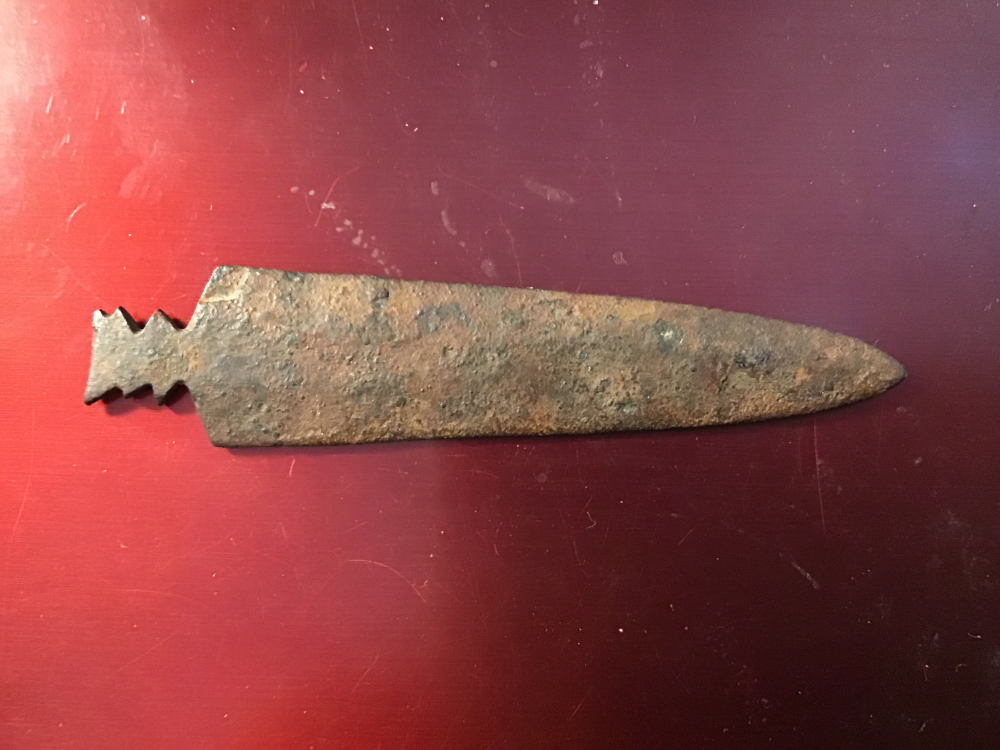 From the Northern High Plains, this metal arrowhead/Spear point has a fine tip and just under 3”. Some rust pitting but not bad at all. It comes with a Bill German coa. I have the shipping.