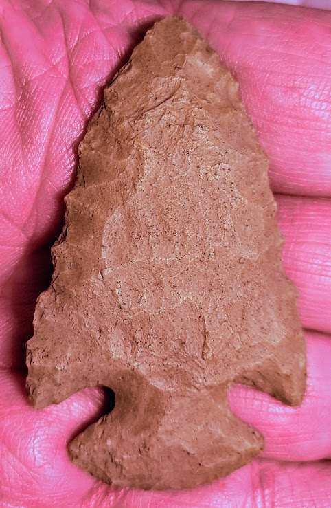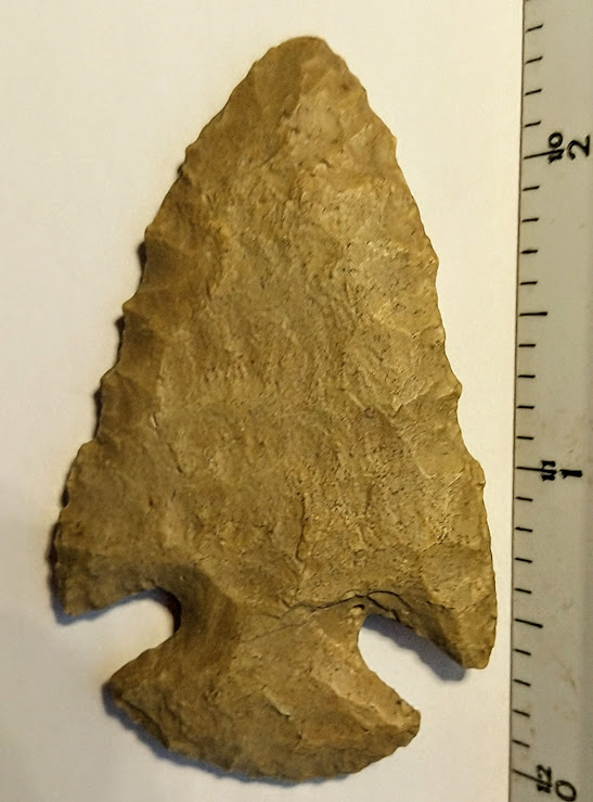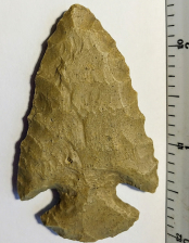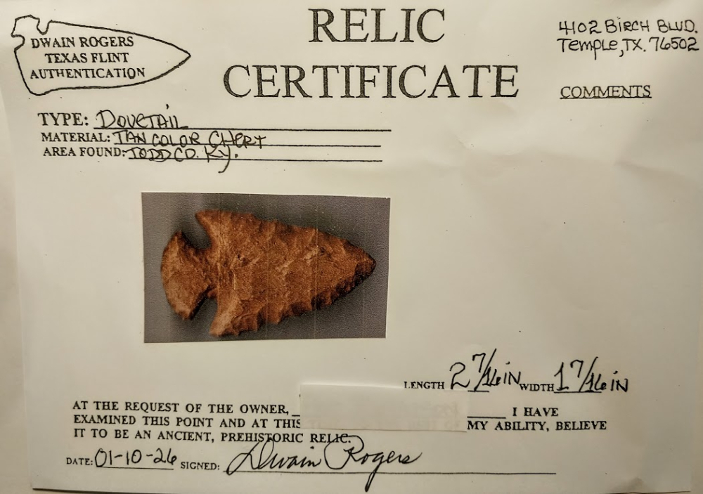This is a very well-made example of a small Kentucky Dovetail. It's very well-flaked and was found in Todd Co., Kentucky. It comes with a Dwain Rogers COA.