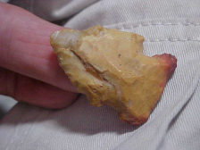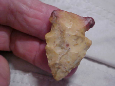 A point from the 'lifetime finds' of a very elderly Gibson county, Indiana, farmer--now, is the flint Indiana Indian Creek, or is it Illinois Kaolin Flint--flip a coil, I think you could make a case for either of those cherts. Length is very slightly over 1&1/2" by 1&1/16". If (as I assume) this was a Stilwell Point, there was little basal edge grinding--some, yes, but it's light. Stilwell points, often found with Kirks, well, basal edge grinding wasn't top priority with the culture. The blade--I wouldn't even venture a guess as to how many sharpenings the edge went through, but Stilwell pints can be very long in stage one form. The Early Archaic user may have exhausted the cutting edge, but a colorful, guaranteed authentic cornernotch remains. Shipping is $7.00, postal minimum these days, and checks, cash, or M.O.s are the only payment forms this store accepts. Thanks for looking--Roy A.