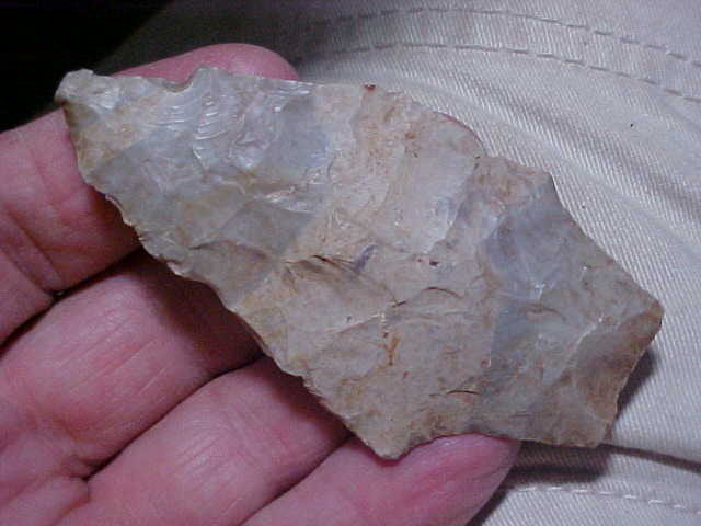 A 3&3/16" Dixon Point, that contracted stem, but quite a blade, 1&5/8" wide and 7/16" thick--measured on a center 'stack' in the flint. GREAT patina. Out of St. Claire County, Illinois (somewhat near St. Louis). The blade shows multiple sharpen-and-use cycles. Guaranteed authentic in every detail. Shipping is $8.00, checks or M.O>s are welcomed--cash, too, but I do not use paypal-type payment services--Roy A.