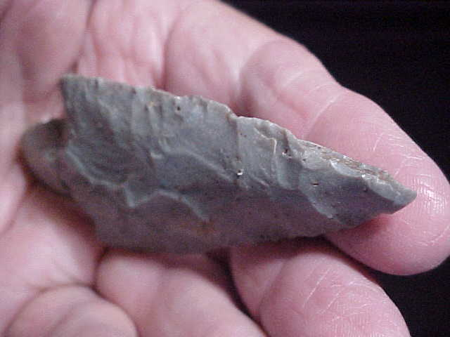 Shipping included on this 3&5/8" by 1&3/8" Waubesa. The piece came out of a Union County/ Jackson County, Illinois, assembled collection, but the flint is either Indiana or Kentucky Hornstone--Richard B., the collector bought selected pieces in addition to what he found--I suspect this one came from a trusted dealer he'd dealt with. The surface: many, many black mineral dots on the surface of the big point/ knife--the patina is no brainer, 100% guaranteed authentic. There is slight wear on the side of the tip, a close up photo should show it. I welcome checks or M.O.s but do not use payment services (like paypal)--Roy A.
