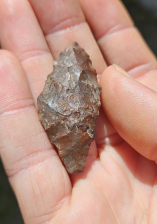 Fine little dart point that was legally recovered in Teller Alaska many yrs ago. Very unique and well made shouldered dart made from AK chocolate chert with some interesting bands. Measures 1 7/8 inches long. Nice piece!