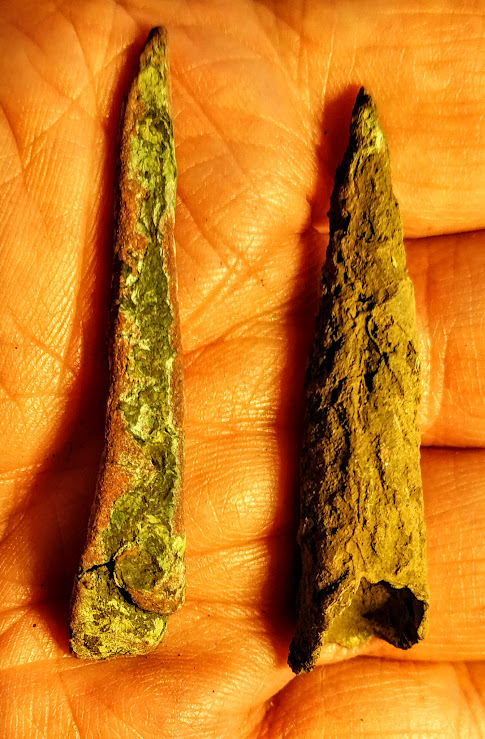 This is a great group of Old Copper Culture (OCC) artifacts that Native Americans shaped from native copper or "float copper" found on the Upper Peninsula of Michigan. This grouping includes a large knife, a fantastic fishhook, two projectile points, and an awl. These artifacts were found in Delta Co., Michigan.