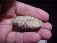 Sort of an orange/ rust colored granite Celt with green bandings, the small (1&15/16" by 1&3/8" by 3/4") thick Celt was found along the lower Wabash River--I'd assume the Indiana side of the stream, but the family could have just as easily boated to the Illinois side to hunt their favorite sites. The Woodland piece, likely Hopewell based on the percentage of Hopewell artifacts in their collection, has a grainy surface--well shaped to form, but definitely, VERY definitely not polished. Someone once told me that soil acidity can almost 'etch' granite--if so, that was an almost corrosive soil. The bit is well formed, but not a 'crisp' edge--maybe that was from heavy use, whatever a smaller size Celt was needed for. Neat, authentic piece. Shipping is $7.00, checks or M.O.s are welcomed, but paypal-type payments are not used on my store--Roy A.