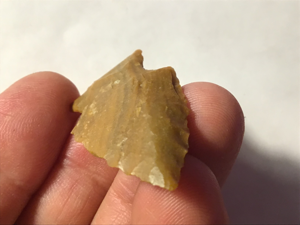 Steep left-hand bevels on this Wilson found by Joe Owens in Harrison County. The base is thinned and shows grinding, lightly serrated to a nice tip. I will guarantee authenticity and satisfaction.