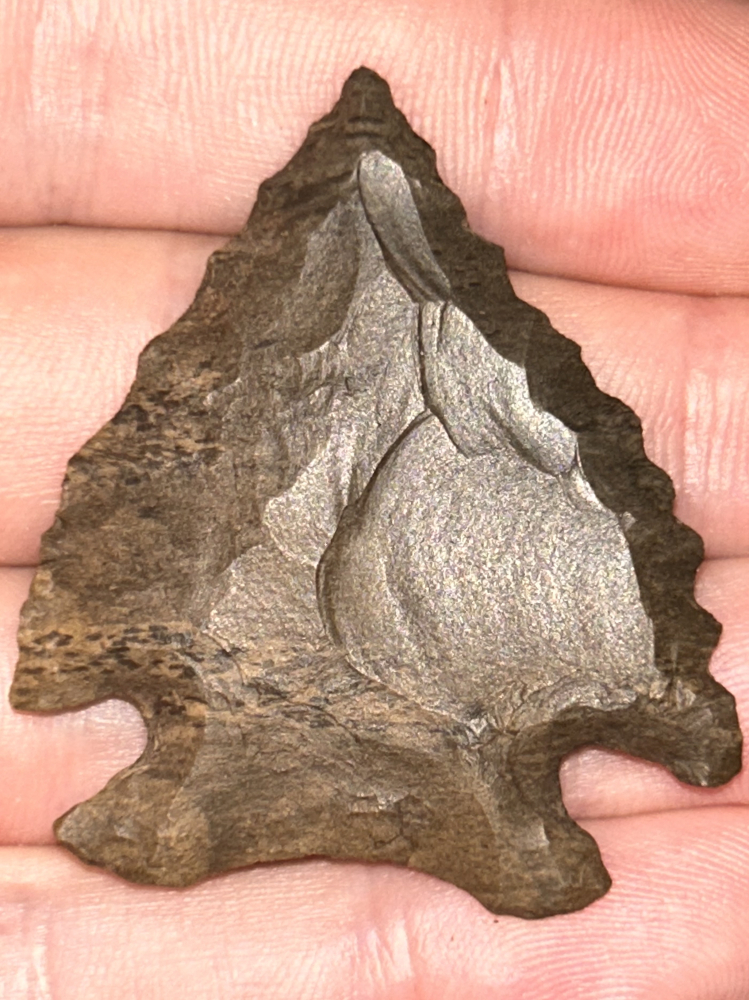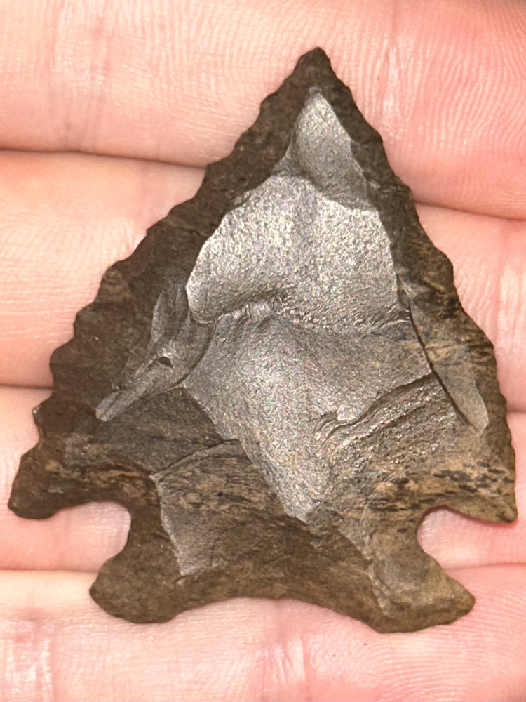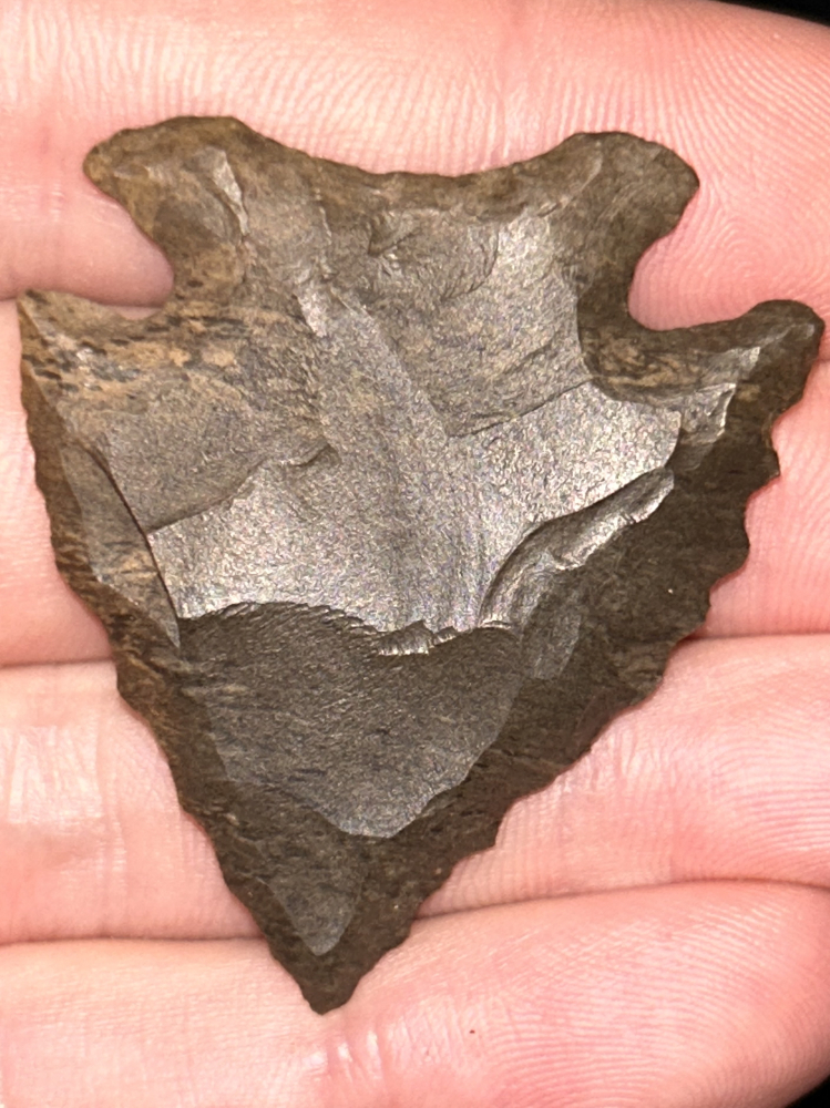 A super nice Decatur found in Hardin County, Tennessee. Made from well patinated mottled brown Dover chert. Great style and form with rugged serrated edges and heavy basal grinding.