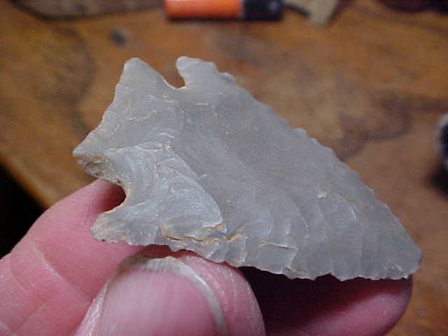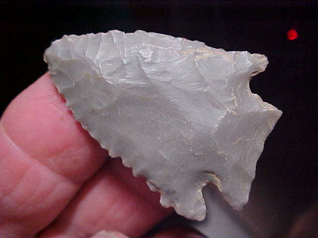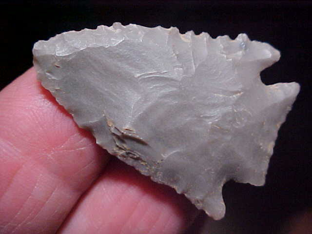 A Vanderburgh County, Indiana, point made of our Harrison County, Indiana, hornstone, 1&11/16" by 1&3/16" with a 1/4" max thickness--nice serration, moderate level of basal edge grinding. The only damage is an Early Archaic-made (and ground smooth) basal corner. Patina is excellent, everywhere, every detail is guaranteed authentic. Shipping is $7.00, checks or money orders are how I take payment. Sorry, that means paypal-type payments are not used--Roy A.