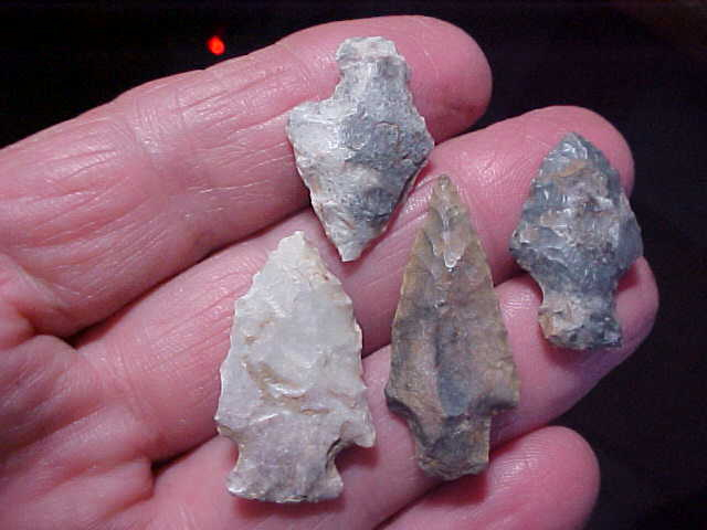 The group consists of four Gibson/ Posey County, Indiana, points--just decent points that are 100% authentic (and made of good flints). The stemmed point is the longest at 1&3/8"--it's somewhere between a hornstone and a river pebble that was put into service. The white/ tan Cornernotch is Early Archaic Culture, heat-treated flint, a nicely ground basal edge--not quite to 1&1/4". The final two are somewhere between 'stemmed' and Motley-based--seem to actually be the same flint when you study the colors seen in each one--nice "Birdpoints", REAL. $8.00 shipping, and I welcome checks, cash, or M.O.s, but please note that my store does not use paypal-type payment services--Roy A.