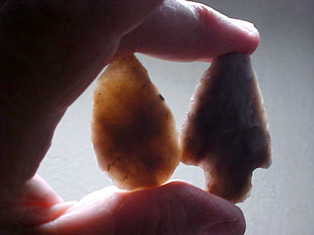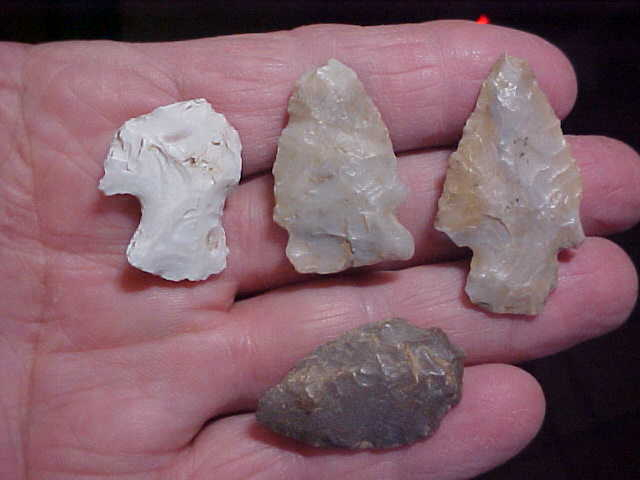 Out of the St. Claire County, Illinois, area, a dozen points, perforators, small blades--and a Hafted Scraper. A pair are made of a semi-0translucent material like a dark sugar quartz (glue on the back of the purple-mottled one)--there is 'regular Burlington (glossy white), heat-treated Burlington (rose/ rust color). The longest of the twelve is a fossil chert, 2&7/16". Three pieces are grey Hornstone, two are glossy Chalcedony, and a teardrop shaped piece that's either Attica Chert or a Jasper--I can't decide which. ALL are 100% guaranteed real, tools that have seen long usage in their respective time periods--read that as used, salvaged, used some more, and eventually lost. Neat pieces. Shipping is $9.00, checks, cash, or money orders are the only ways you can buy these as I do not use paypal-type payment services--Roy A.