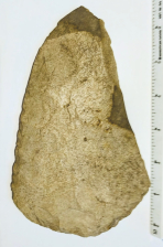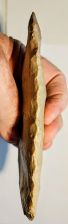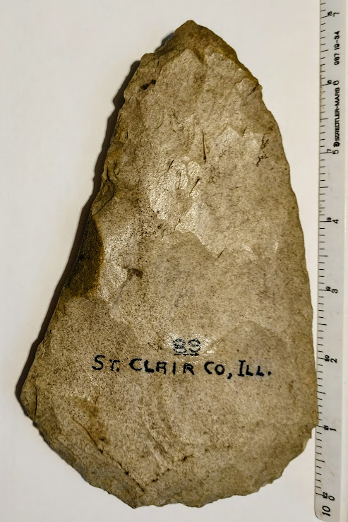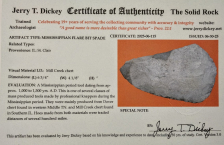 This is an excellent example of a Polished Flare Bit Spade. This Mississippian period artifact was found in St. Clair Co., Illinois, and comes with a Jerry Dickey COA. It would make a great centerpiece for a large frame!