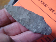 A Sangamon County, Illinois, Gary (or Dixon),2&3/4" by 15/16", but only on a small 'center stack' is thickness even 5/16"--most of the length, tip and base, is 1/4" thickness. On the stem are veins of white fossil inclusion--interesting flint, very well patinated with age (and guaranteed real). Shipping is $7.00 (USPS minimum charge for small boxes anymore)--checks, cash, or M.O>s are the ways I welcome payment. Sorry, paypal is not used--Roy A.