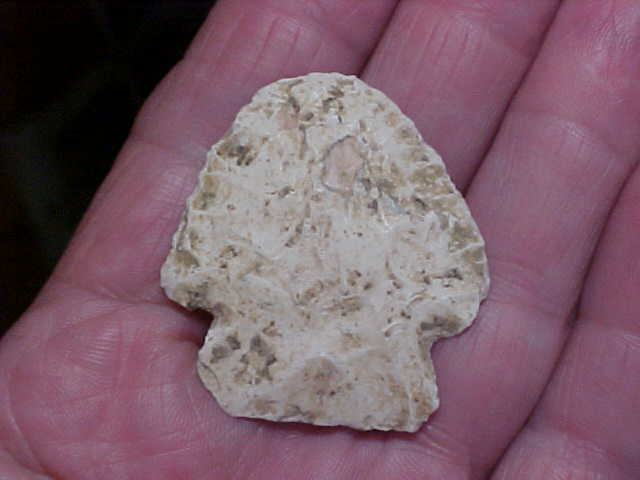 $20 covers the point and the shipping (which by new USPS rates is $7.00). The creek find (see patina on the side that was face-down) from Vigo County, Indiana, measures 1&3/4" by 1&9/16", yet only 1/4" max thickness. The photos won't show that sort of detail--wish they could, but the rounded top edge is heavily, heavily use polished. I've debated what to even call the point, it it a Cornernotch, is it a Thebes with some breakage on the base and barbs, but being so thin, "Archaic Culture" is as close as I've come--you have a suggestion, I'd be more than happy to hear it--sometimes, just making a 'classification' is a challenge, especially on a piece that had significant ancient salvage & use. One note--check out the lateral flake scars on the 'clean face'--there was some interesting salvage going on, I think. Regardless, every detail is guaranteed authentic. Payment can be by check, cash, or M.O., but I do not use paypal-type payment services--Roy A.